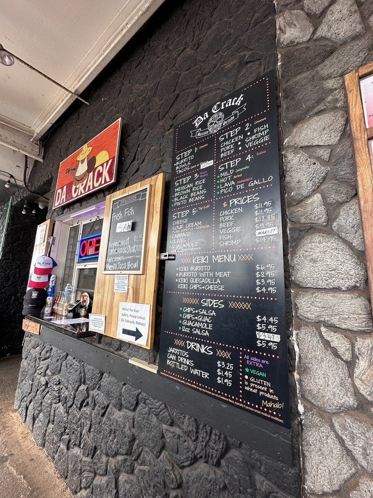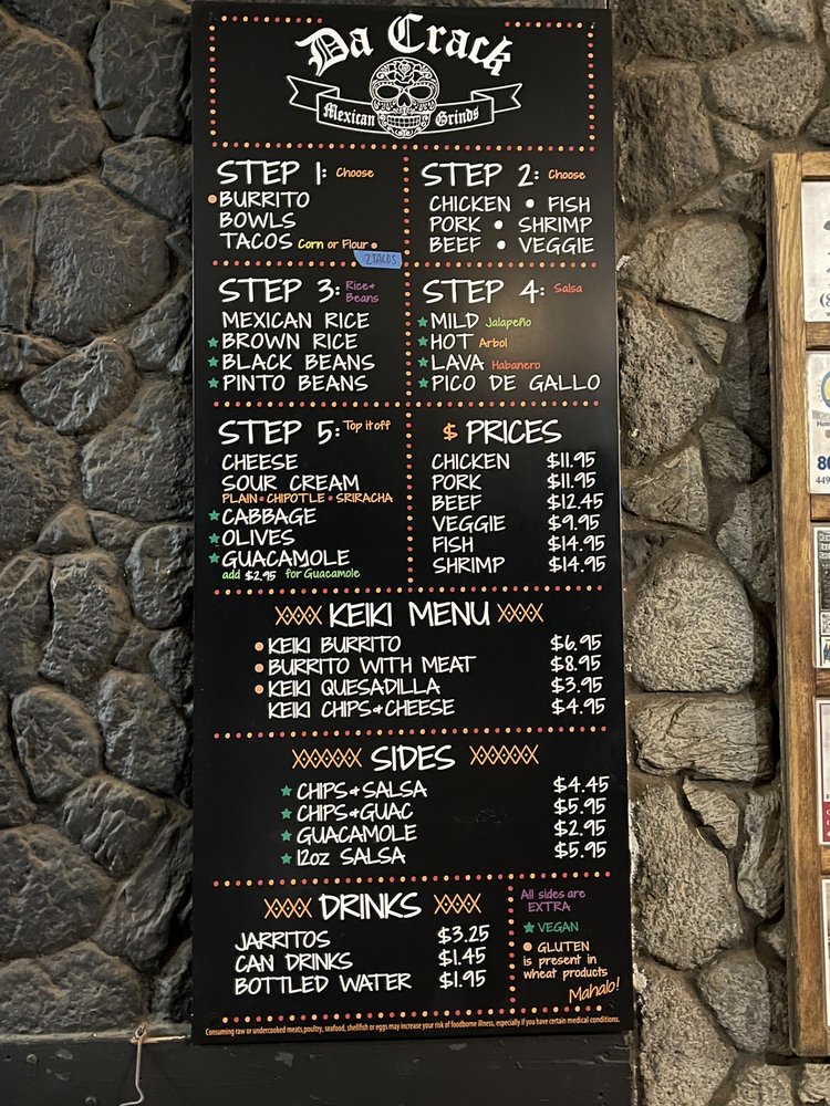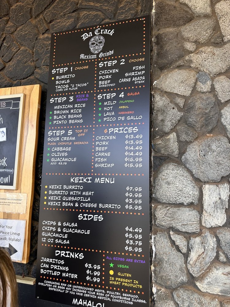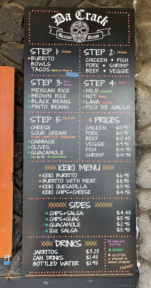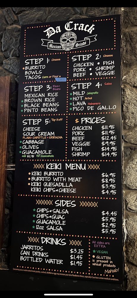 Introducing the menu at Da Crack Mexican Grinds in Koloa, Hawaii, a fast-food Mexican joint offering a variety of options including burritos, bowls, and tacos. One standout feature is their Kids Menu with options like Keiki Burrito and Quesadilla. Sides like salsa, sour cream, and chips are also available. Customers rave about the delicious and filling meals, with favorites being the shrimp burrito, fish bowl, and carne asada bowl. The ingredients are fresh, seafood is sourced locally, and flavors are well-balanced. Despite being a takeout-only window with no seating, the quality of the food and service make it worth a visit. Enjoy the convenience of online ordering, free Wi-Fi, and the option for outdoor seating. Don't miss out on this hidden gem for flavorful Mexican cuisine in Hawaii.