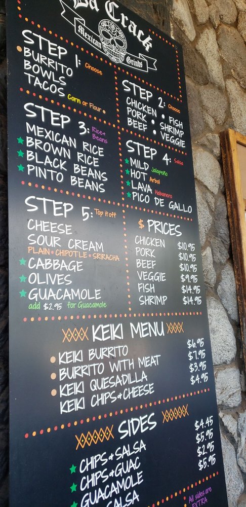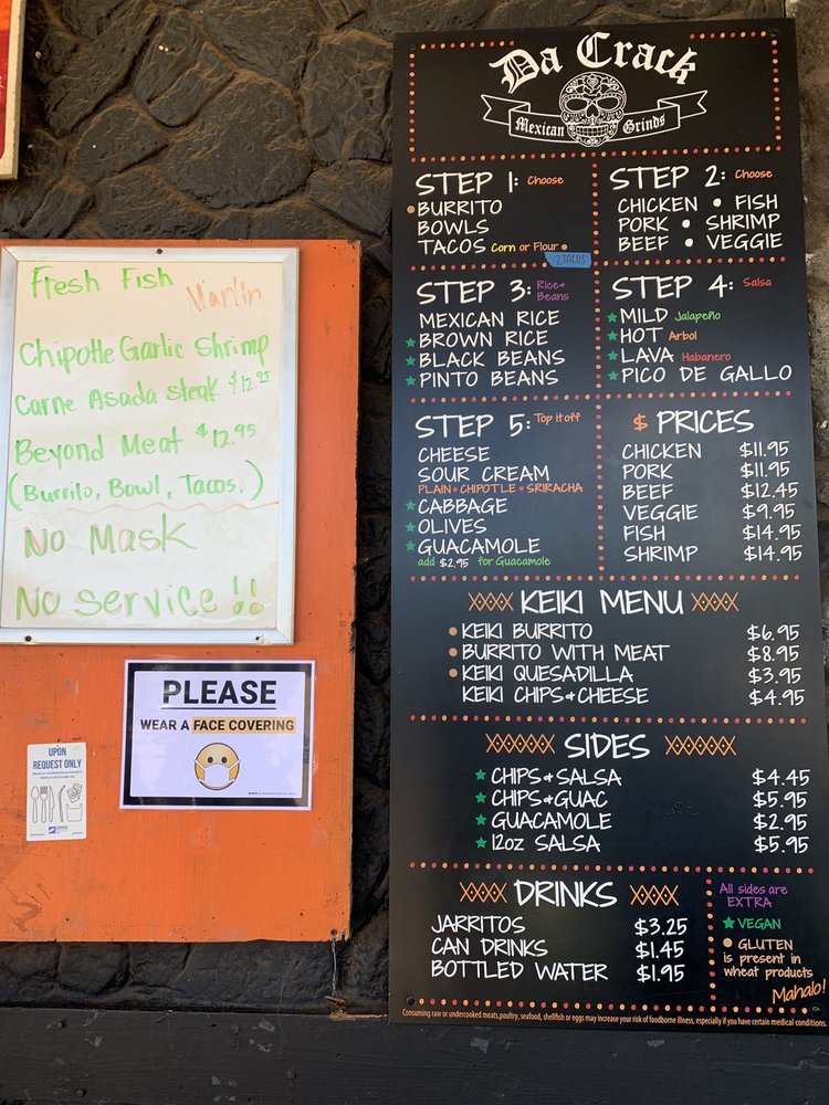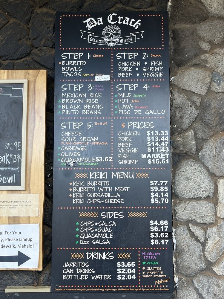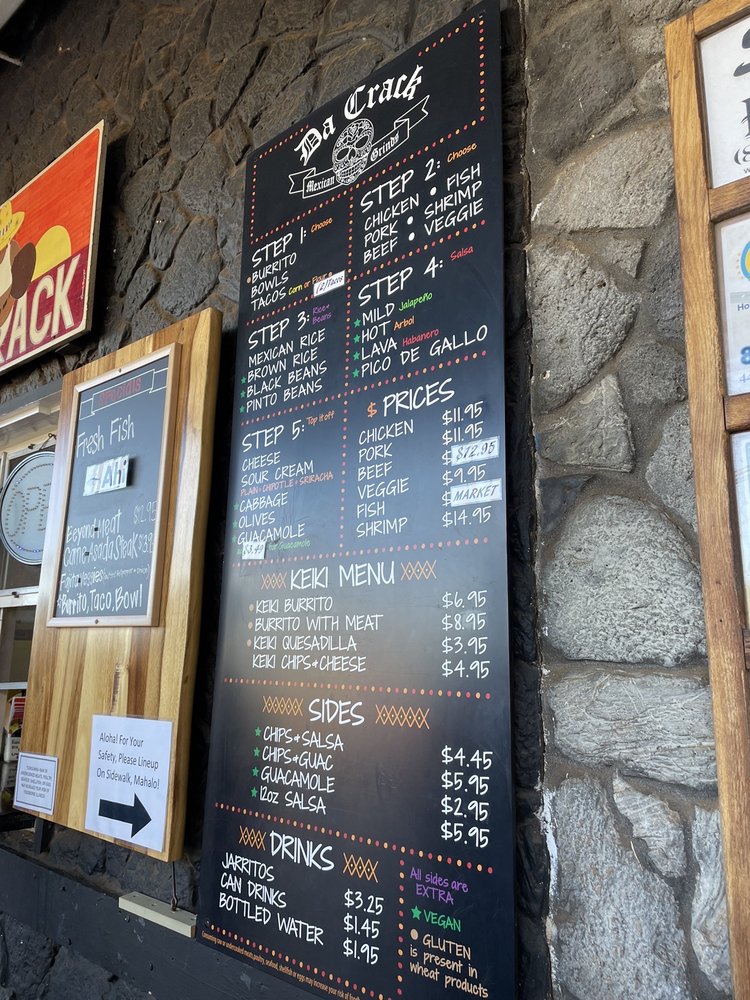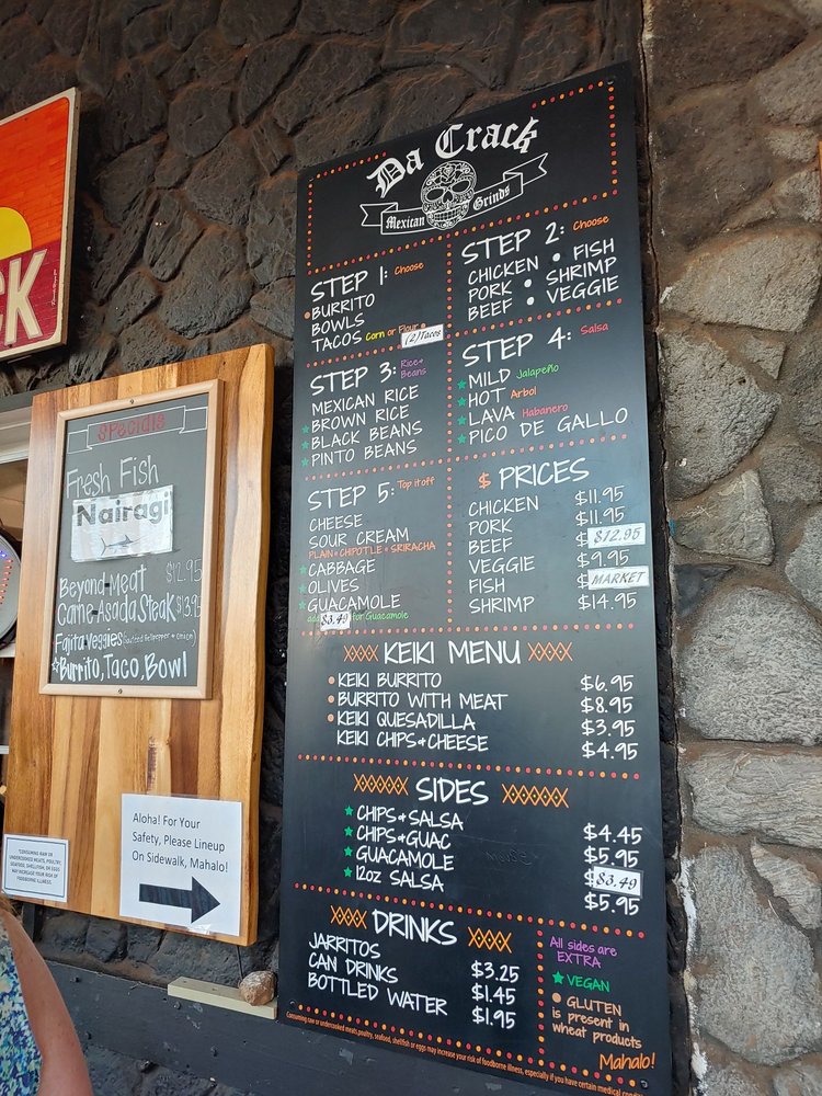 Introducing the menu at Da Crack Mexican Grinds in Koloa, Hawaii, a fast-food Mexican joint offering a variety of options including burritos, bowls, and tacos. One standout feature is their Kids Menu with options like Keiki Burrito and Quesadilla. Sides like salsa, sour cream, and chips are also available. Customers rave about the delicious and filling meals, with favorites being the shrimp burrito, fish bowl, and carne asada bowl. The ingredients are fresh, seafood is sourced locally, and flavors are well-balanced. Despite being a takeout-only window with no seating, the quality of the food and service make it worth a visit. Enjoy the convenience of online ordering, free Wi-Fi, and the option for outdoor seating. Don't miss out on this hidden gem for flavorful Mexican cuisine in Hawaii.